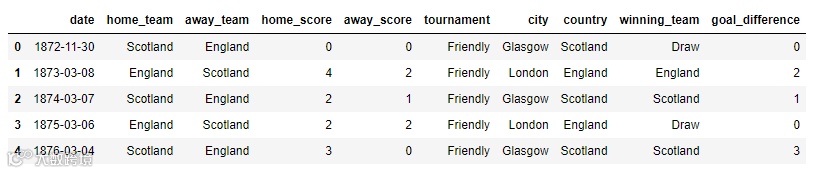 接下来我们要做的便是探索性数据分析和特征工程了,来对数据集有一个大致的了解,同时生成一些针对最后的预测大有帮助的特征出来,例如我们针对比赛当中的比分来判断比赛是谁胜谁负,或者是平局,代码如下