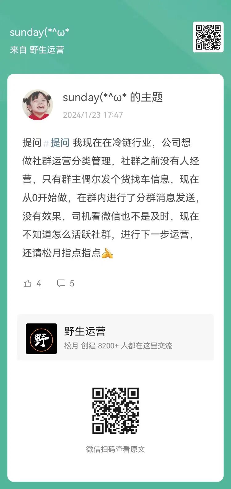2、提问:我现在在冷链行业,公司想做社群运营分类管理,现在不知道怎么活跃社群,进行下一步运营?(扫码查看全文)