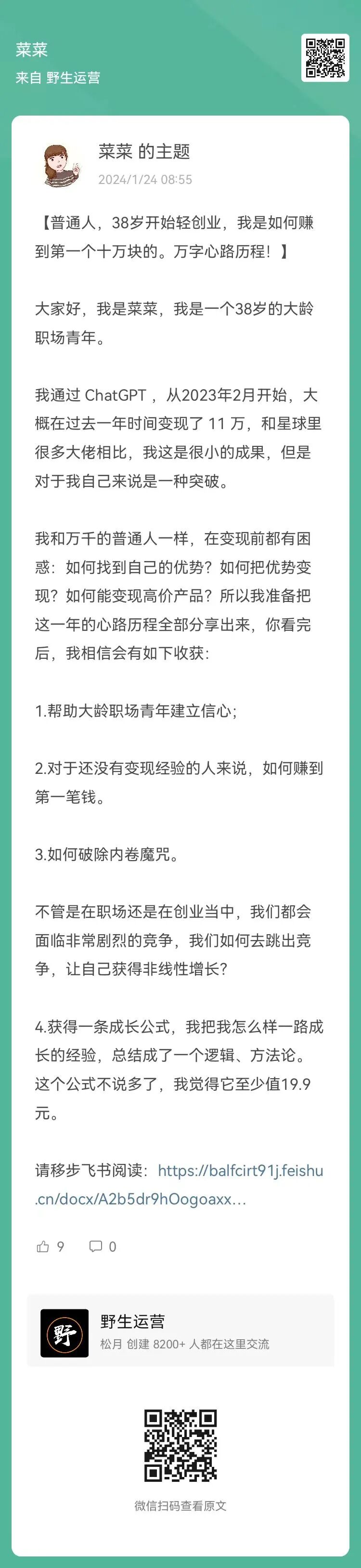 9、菜菜:普通人,38岁开始轻创业,我是如何赚到第一个十万块的,万字心路历程(扫码查看全文)