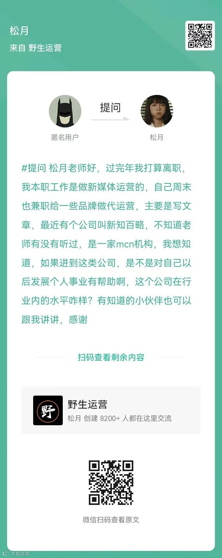 4、提问:想入职一家mcn机构,想知道,如果进到这类公司,是不是对自己以后发展个人事业有帮助?(扫码查看全文)
