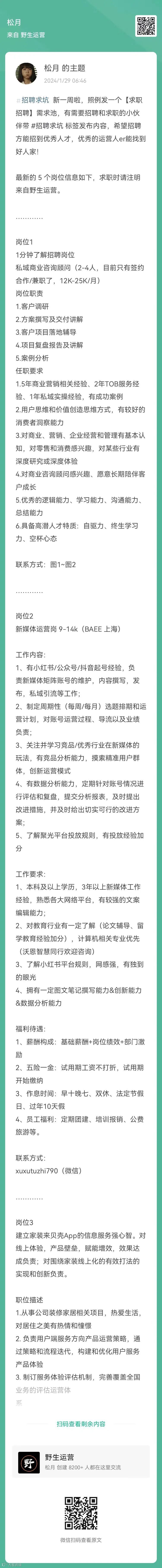 上周更新了5个岗位信息如下,求职时请注明来自野生运营,扫码申请岗位👇