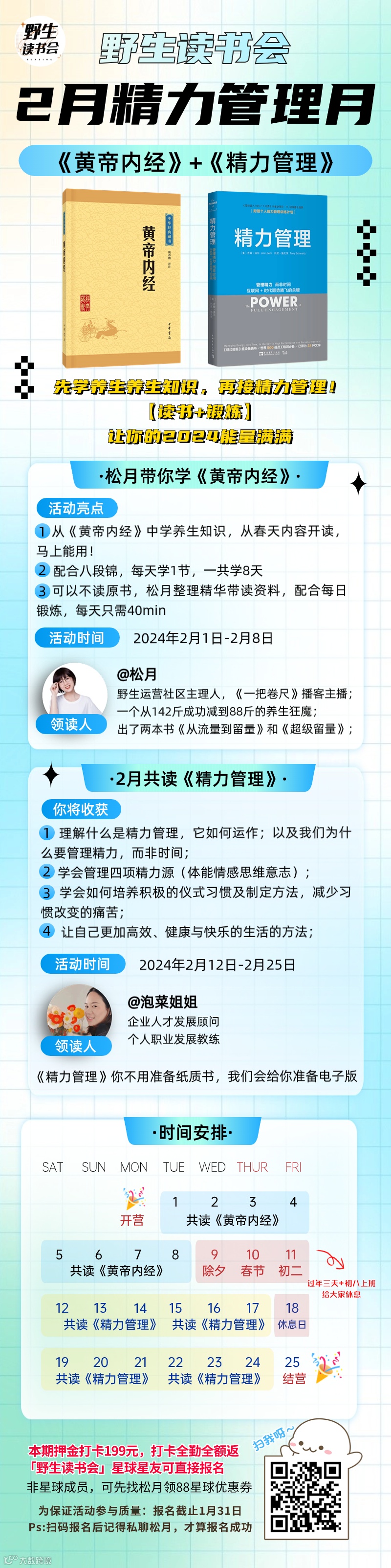 2月共读精彩了,会开启“精力管理月”!会由松月领读《黄帝内经》和带练八段锦,春节期间休息3天,接着会由泡菜接棒,带领大家共读《精力管理》,为了保证活动体验,本次限量报名!