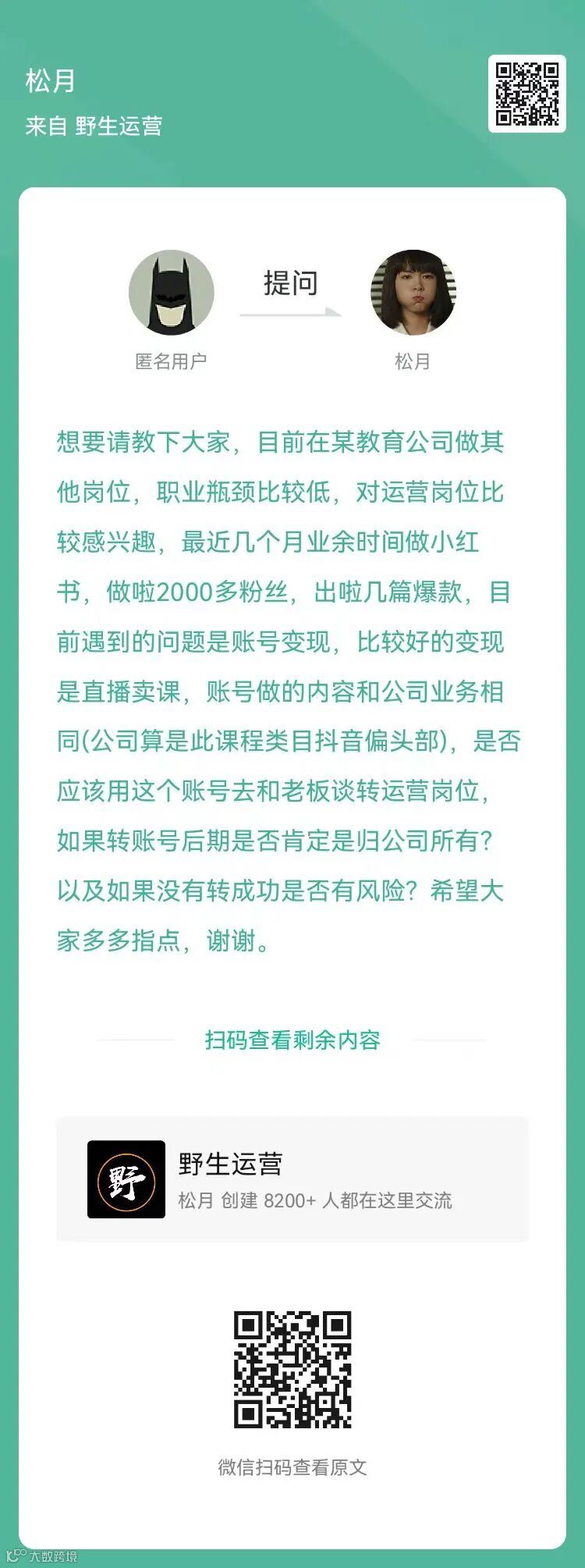 1、提问:是否应该用小红书这个账号去和老板谈转运营岗位?(扫码查看全文)
