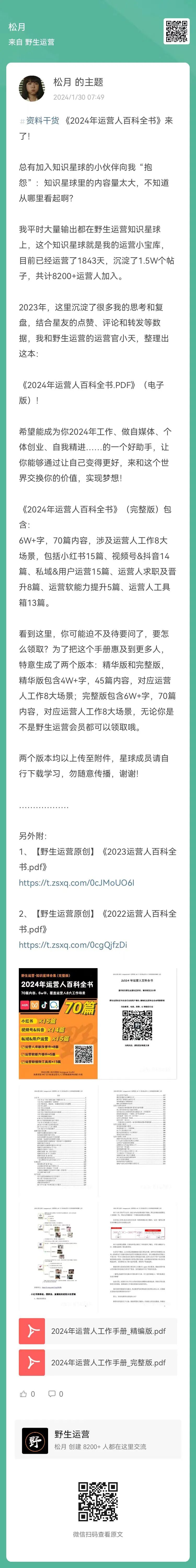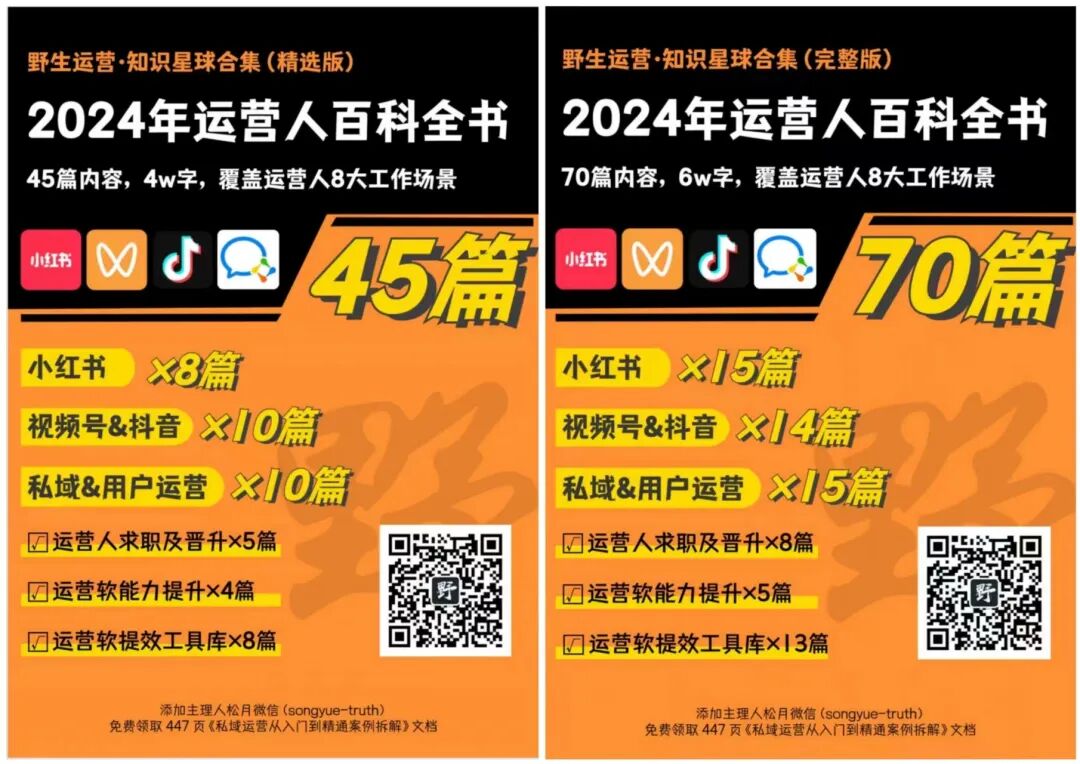 也经常能在星球上收到大家关于“星球内容太好了,但也有点多,不太方便整理”的需求,于是和运营官小天一合计,把星球上大家阅读最多、点赞最多、评论最多……的内容精选起来,按归类整理出一本《2024年运营人百科全书》!