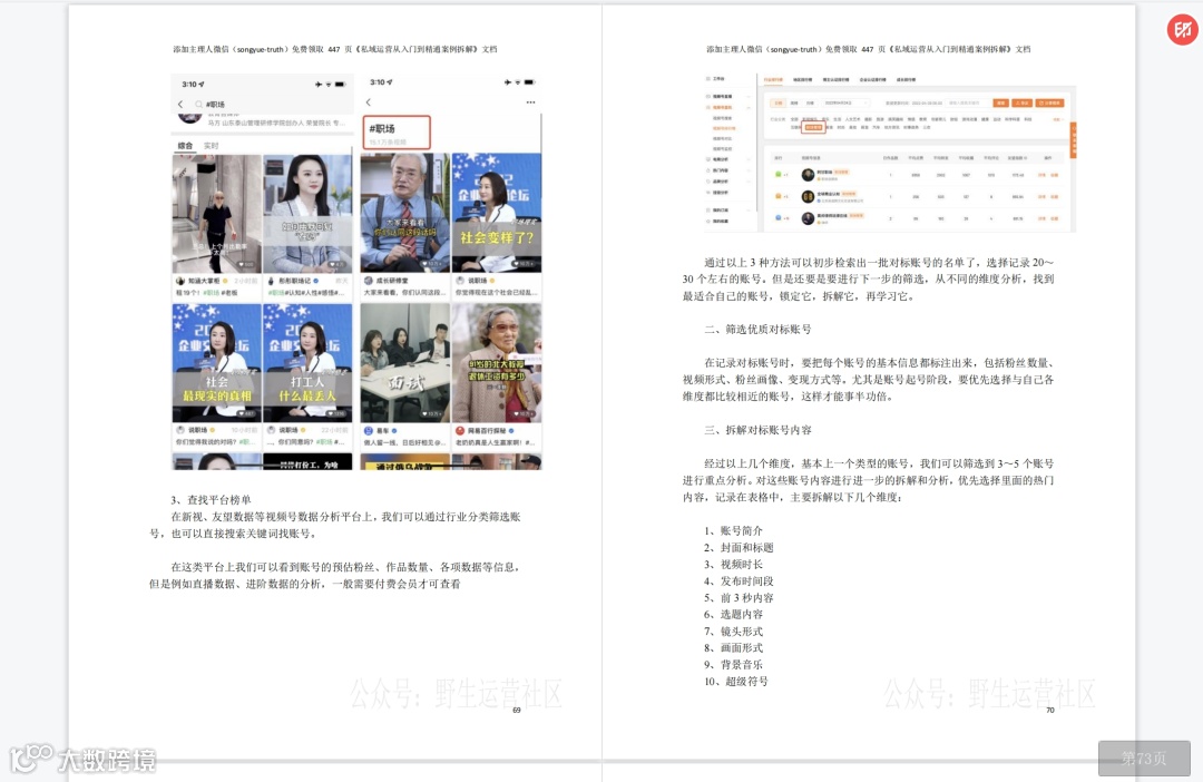 6W+字,70篇内容,涉及运营人工作8大场景,包括小红书15篇、视频号&抖音14篇、私域&用户运营15篇、运营人求职及晋升8篇、运营软能力提升5篇、运营人工具箱13篇。