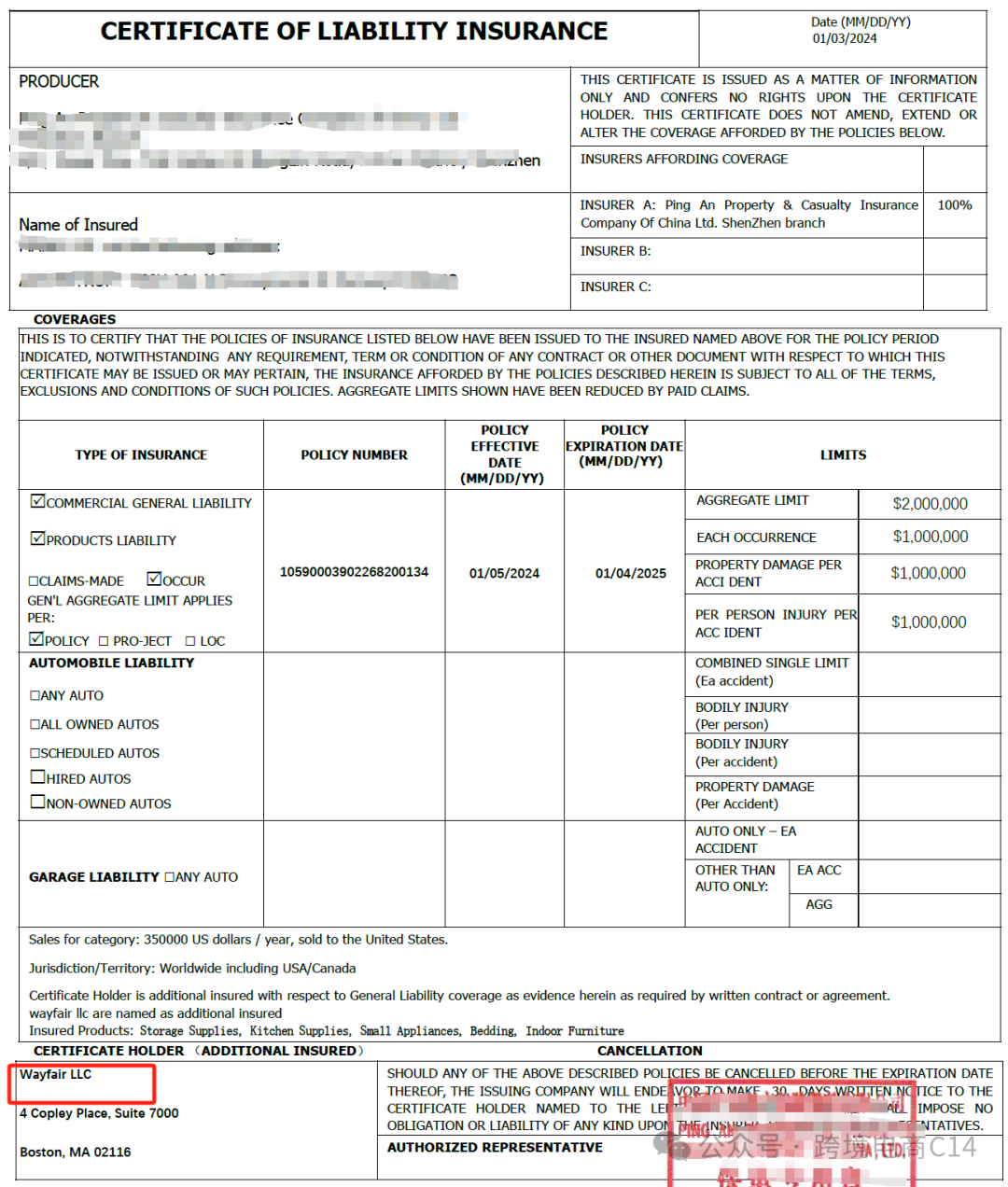 Wayfair的产品责任保险(简称产责险)条款中,附加被保险人将从原来的Wayfair LLC更改为Wayfair Inc。这一变化对所有续保的卖家都有影响,因此务必及时更新保险凭证(COI)。