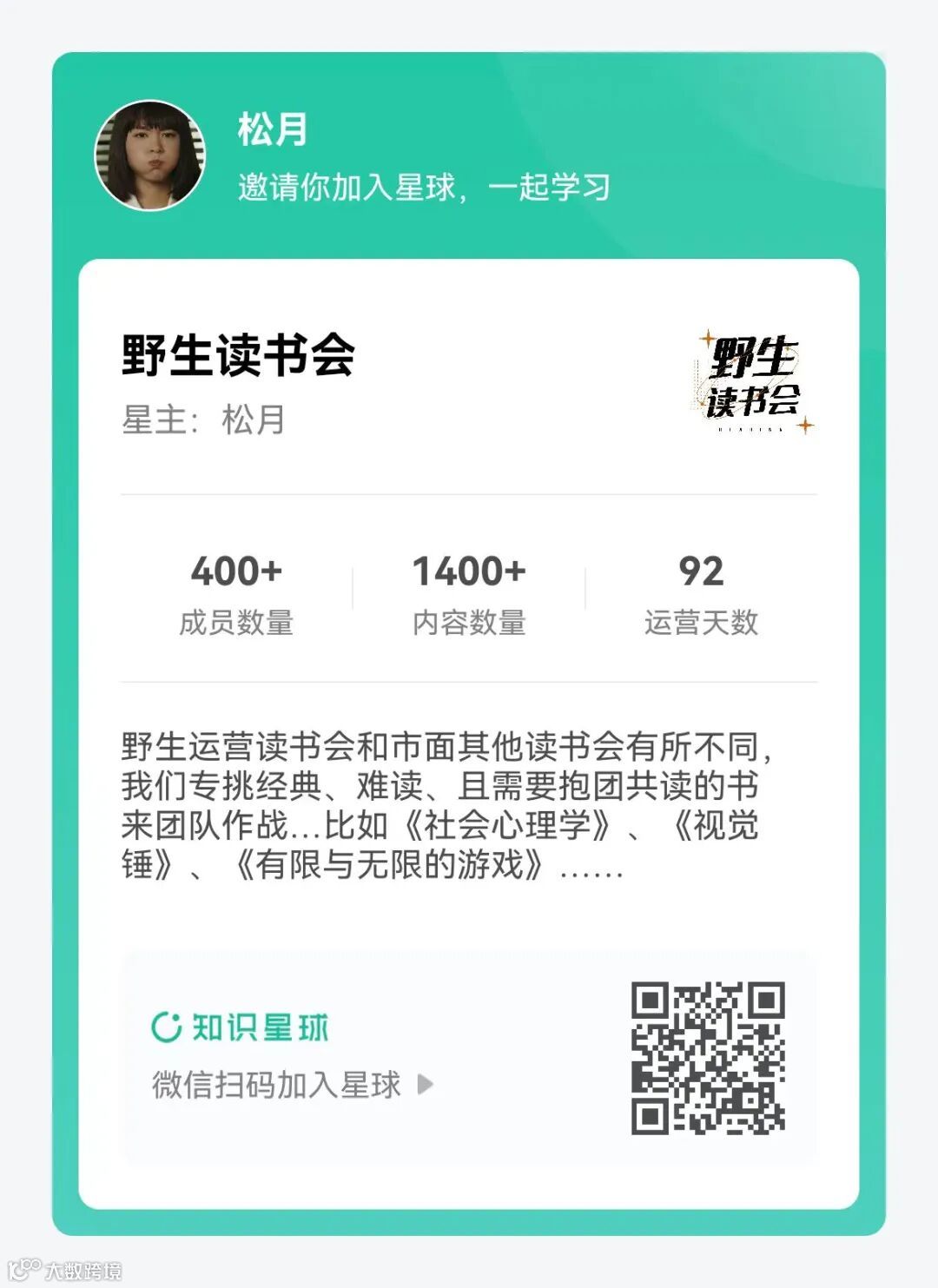需要是野生读书会知识星球成员,所有的打卡、讨论和交流都在上面进行。目前野生读书会星球开张大吉,目前加入99元/年,后面会涨价到199、299…感兴趣的小伙伴可扫码↓↓↓加入哦,一起学习😍和400+小伙伴一起把读书当成终生事业!