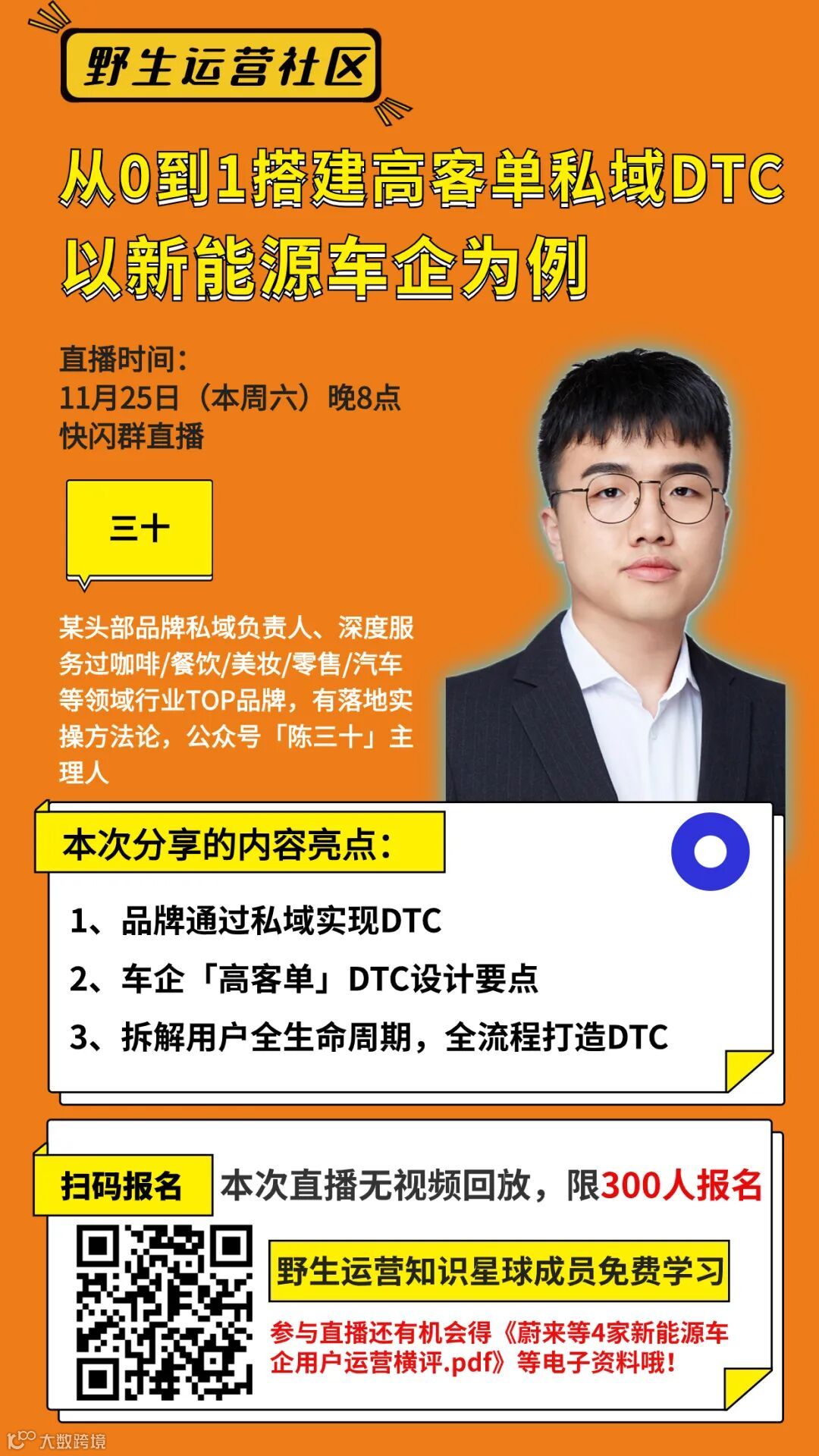 本周六晚8点,我邀请到三十,某头部品牌私域负责人、深度服务过咖啡/餐饮/美妆/零售/汽车等领域行业TOP品牌,有落地实操方法论,公众号「陈三十」主理人,带来快闪分享《从0到1搭建高客单私域DTC,以新能源车企为例》😎参与直播,还有机会获得《蔚来等4家新能源车企用户运营横评.pdf》等电子资料哦!