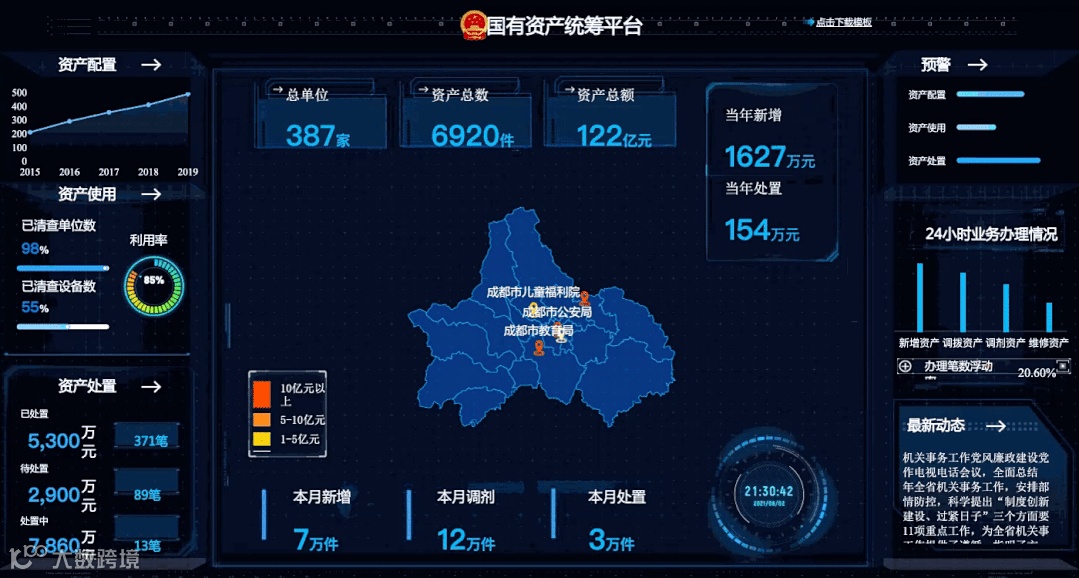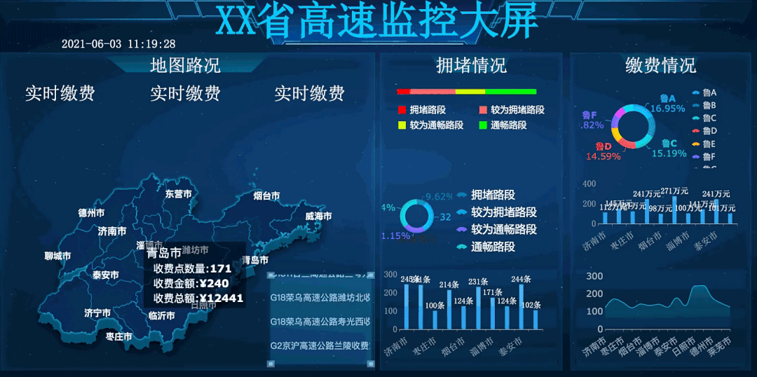 以高速监控为例,在下图的大屏中,依次遍历了山东省每个市的高速收费数据,通过动态轮播引导观看者了解每个市区的信息,做到信息表达完整的同时,也让大屏界面保持整洁。