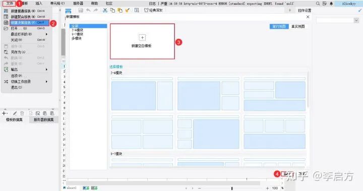 如果你是想自己设计大屏布局,就直接新建空白模板,如果懒得自己设计,可以直接选择FR里自带的布局模板(即图中选择模板处),像我一般就直接选自带的模板,比较方便。
