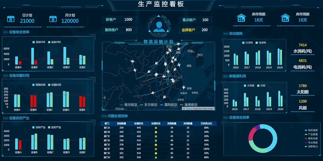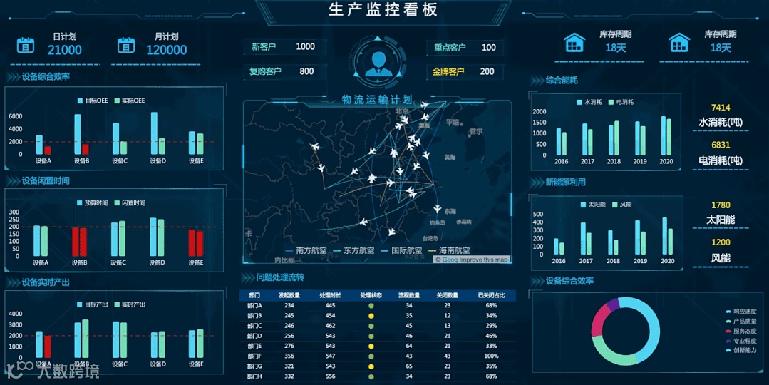 以生产监控为例,在生产过程中需要非常注意异常数据,保证生产的顺利。所以我们在做监控看板时,常需要对监控用的图表设置一条警戒线,同时对低于警戒线数值的系列,设置条件变色和闪烁动画效果,突出异常数据,例如下图的左半部分,就是用警戒线和红色来提醒观看者数据的变化。