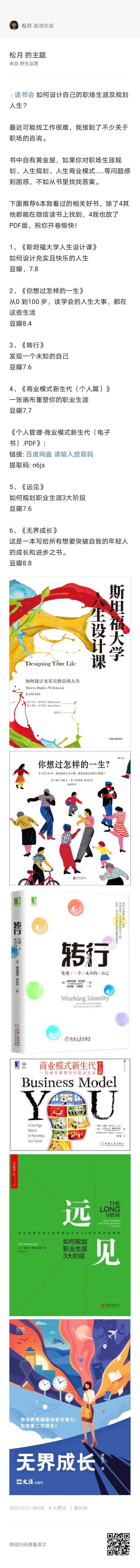 延伸阅读:不少小伙伴困惑,职场生涯规划要怎么做,今天来推荐【职场生涯规划】主题的6本书单,帮助你设计自己的职场生涯及规划人生~扫码可查看原文: