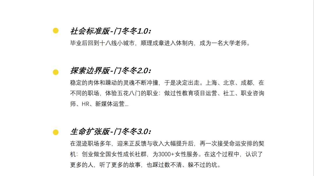 在混迹职场多年,迎来正反馈与收入大幅提升后,再一次接受命运安排的契机:创业做全国女性成长社群,为3000+女性服务。在这个过程中,认识了更多的人,听了更多的故事,也踩过数不清、躲不过的坑。
