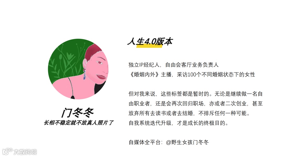 向外展示的标签是:IP经纪人/自由职业者,运营一个全国的自由职业社区;同时,「婚姻内外」的主播,采访100个不同婚姻状态下的女性,是今年给自己的新身份。