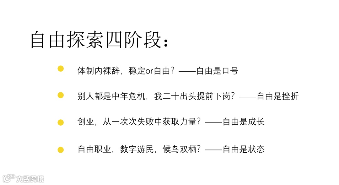 刚刚离开体制的前三年,我在职业发展上都非常不顺。不知道自己热爱什么,更不知道如何把热爱做成事业,虽然没有抑郁,但是失眠、情绪崩溃、想逃离也是常有的事儿。所以经历挫折的那 3 年,我觉得我再次理解了我到底想要什么样的自由。大家可以问一下自己的答案,每个人答案都很有意思。