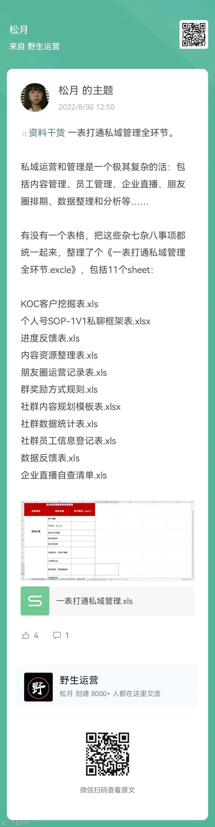 文末加餐:私域运营和管理是一个极其复杂的活:包括内容管理、员工管理、企业直播、朋友圈排期、数据整理和分析等…… 有没有一个表格,把这些杂七杂八事项都统一起来,最近整理了个《一表打通私域管理全环节.excle》,包括11个sheet,供你参考哦👇👇👇