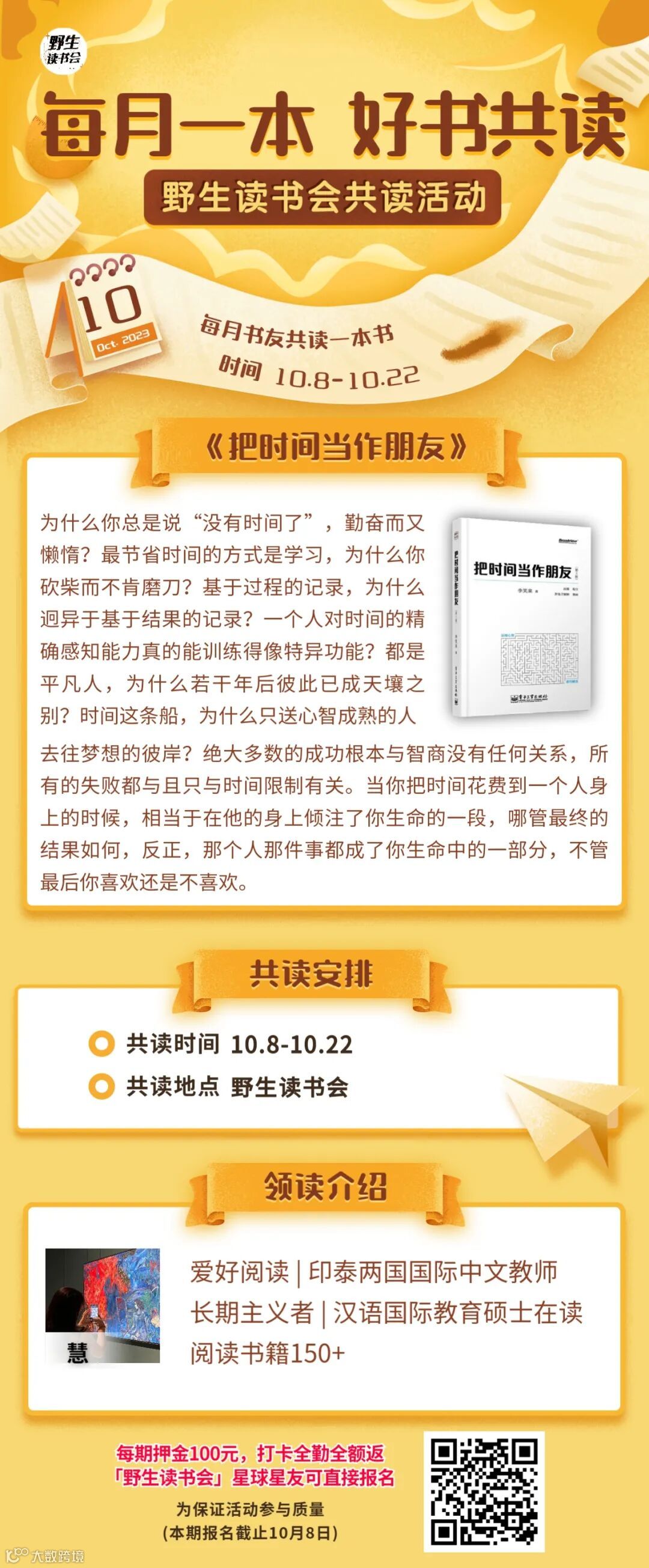 10月8日~10月22日,野生读书会共读书目出炉啦,就是李笑来的《把时间当作朋友》!