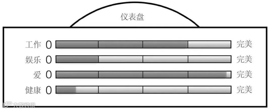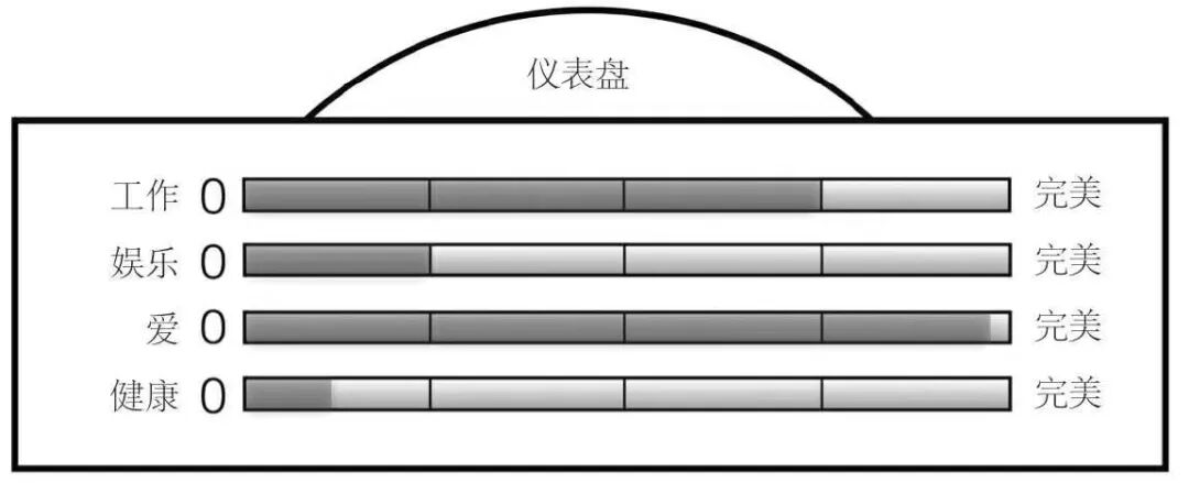 接着,我们用仪表盘去诊断自己的人生现状。如果你想知道,你的生活到底是哪里出了问题,作者为我们提供了一个测试工具,叫做仪表盘,它由四个要素组成:工作、娱乐、健康和爱。就像汽车的仪表盘一样,你可以通过测评各个要素的满意度来评估自己的生活。