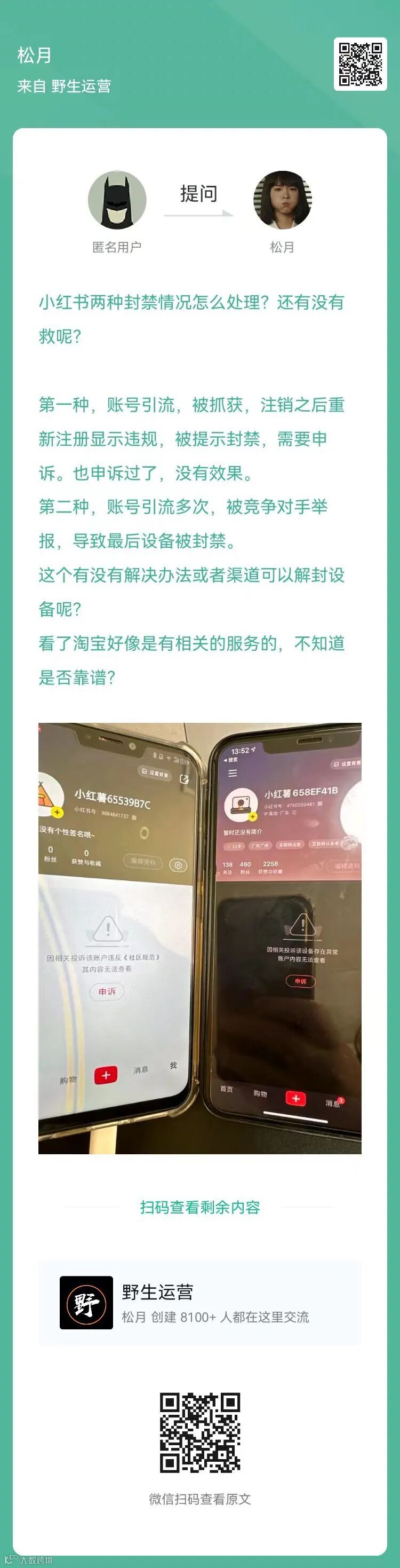 1、提问:小红书两种封禁情况怎么处理?还有没有救呢?(扫码查看全文)