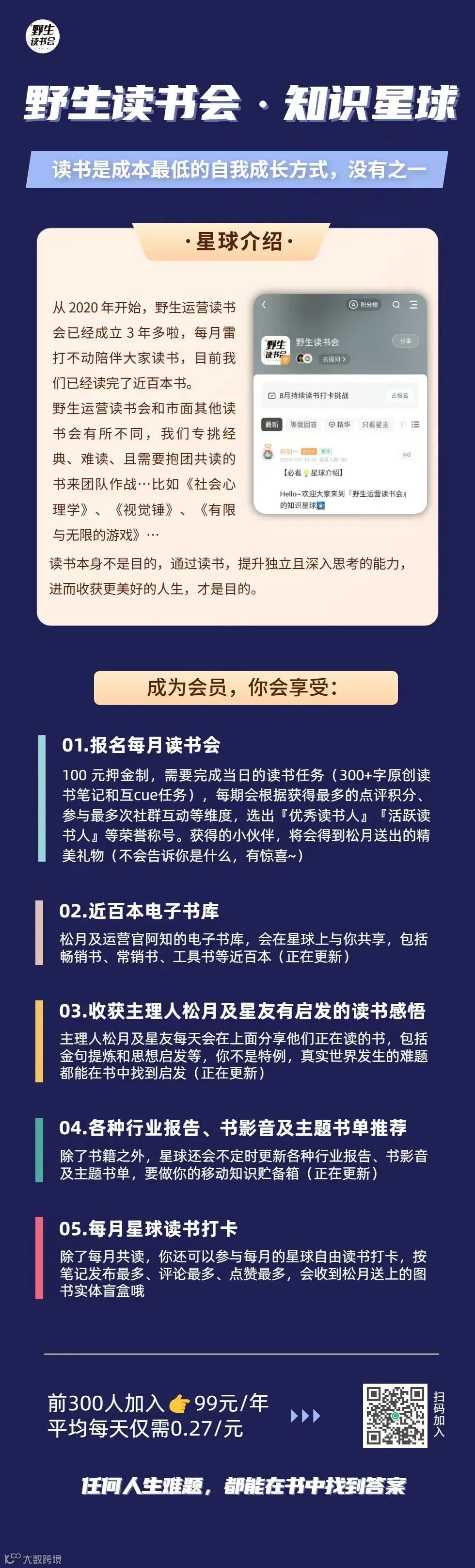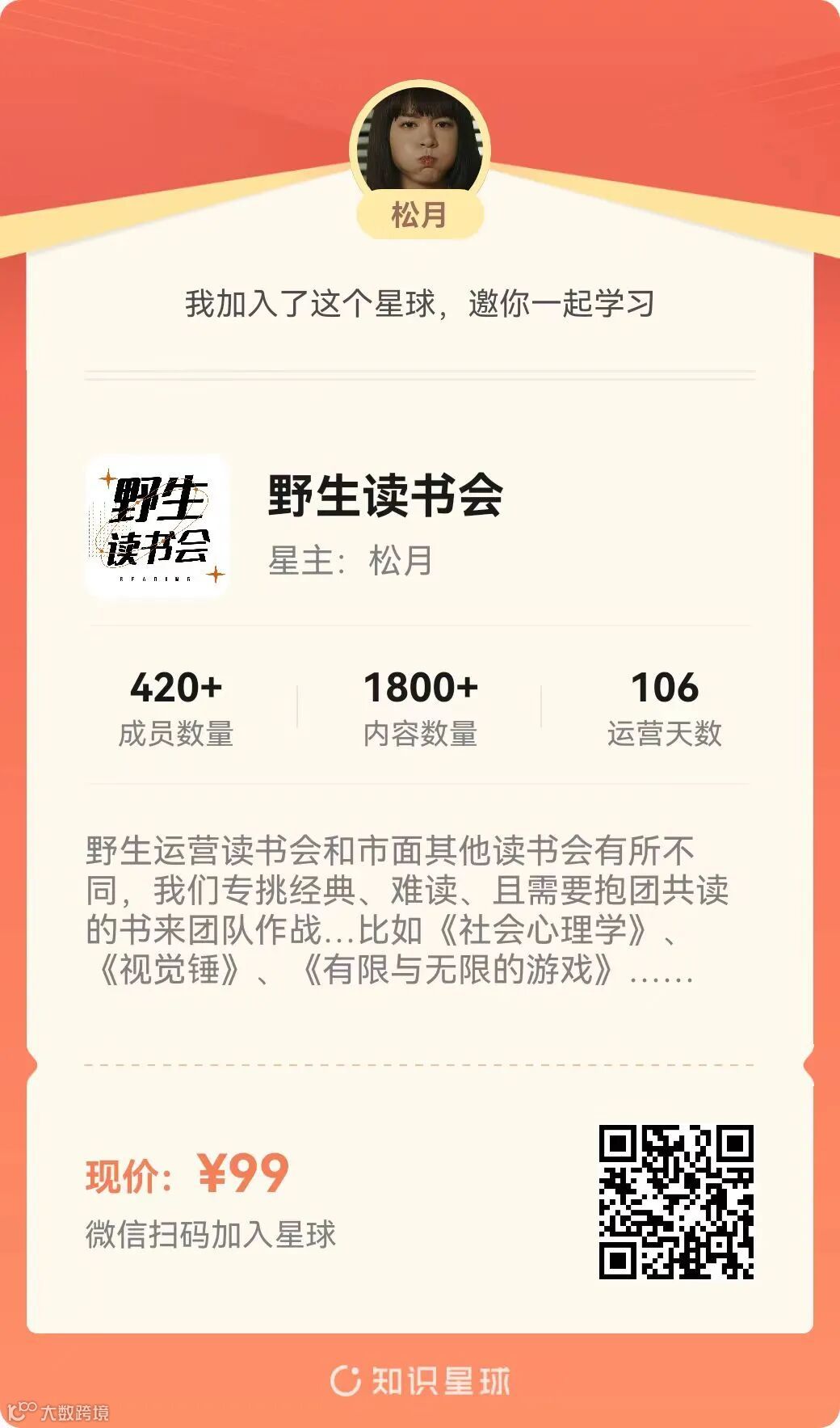 需要是野生读书会知识星球成员,所有的打卡、讨论和交流都在上面进行。目前野生读书会星球开张大吉,目前加入99元/年,后面会涨价到199、299…感兴趣的小伙伴可扫码↓↓↓加入哦,一起学习😍和420+小伙伴一起把读书当成终生事业!