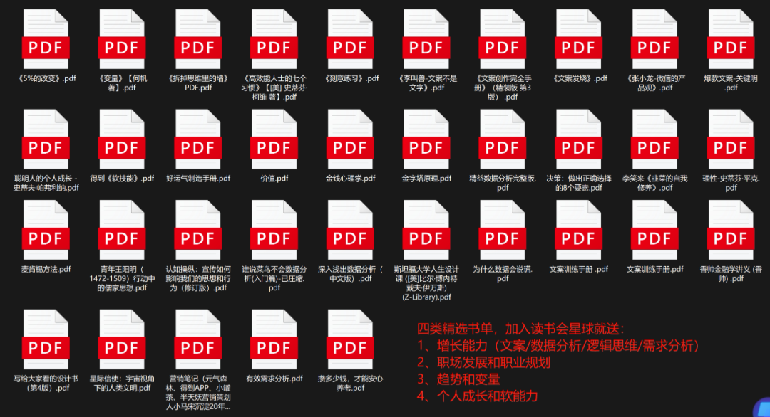 电子书库、各行业研究报告、书影音清单推荐、读书和学习方法推荐、读书感悟和金句……