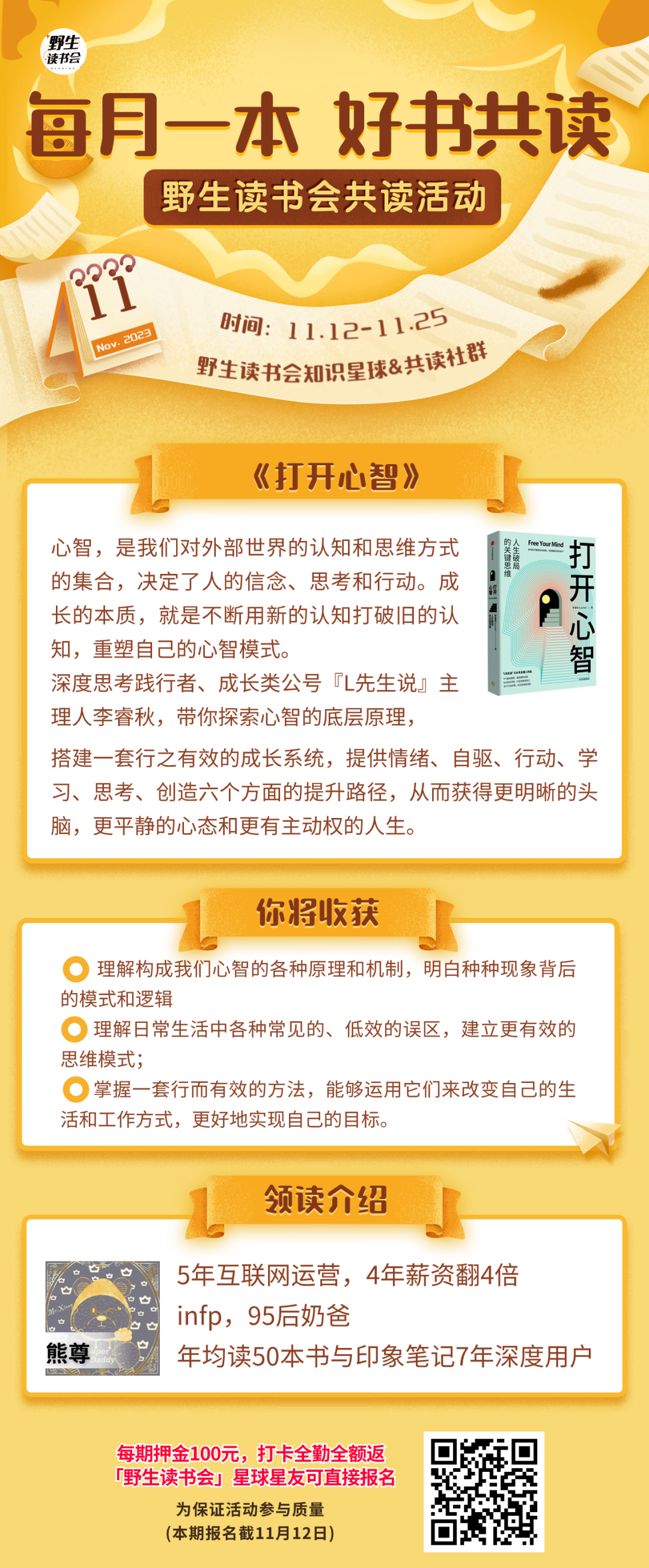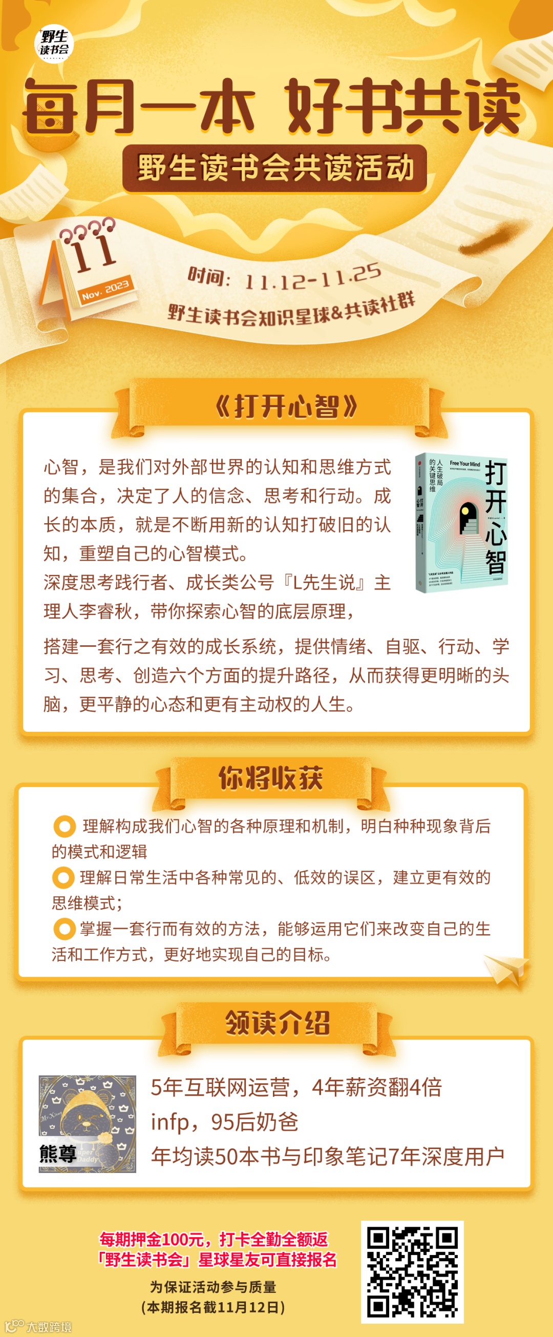 插入一条:不少小伙伴关心野生读书会,下期共读什么书?书单出炉啦,下期我们会读李睿秋(Lachel)【成长类公号“L先生说”主理人】的《打开心智》,你不用准备书籍,我们会给你准备好电子书,所以尽管报名就好啦!
