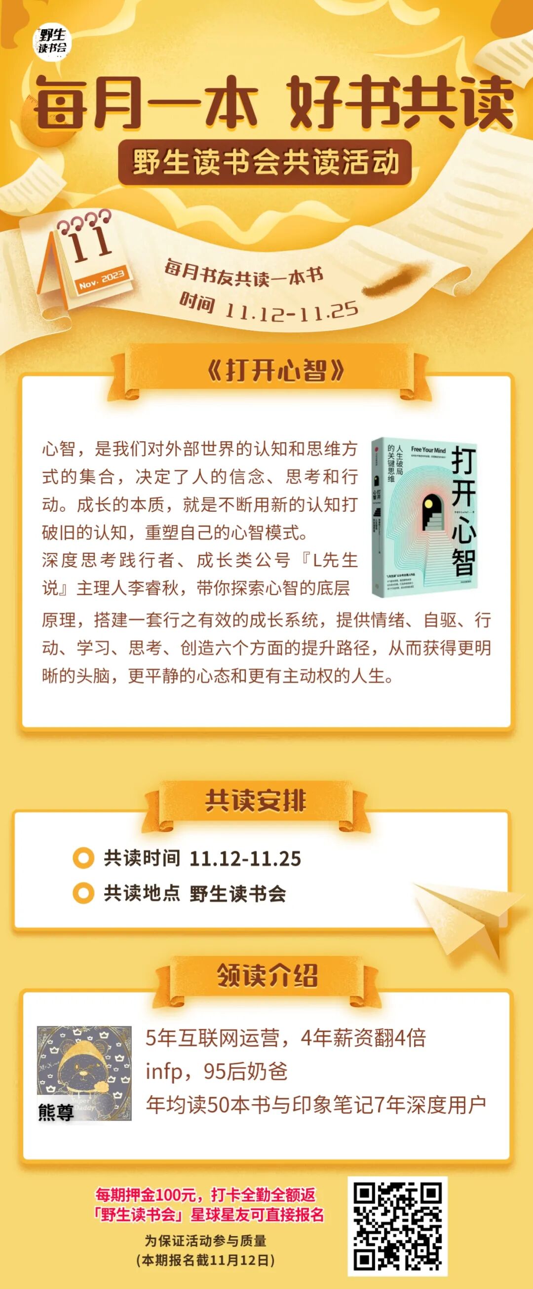11月12日~11月25日,野生读书会共读书目出炉啦,就是L先生的《打开心智》!