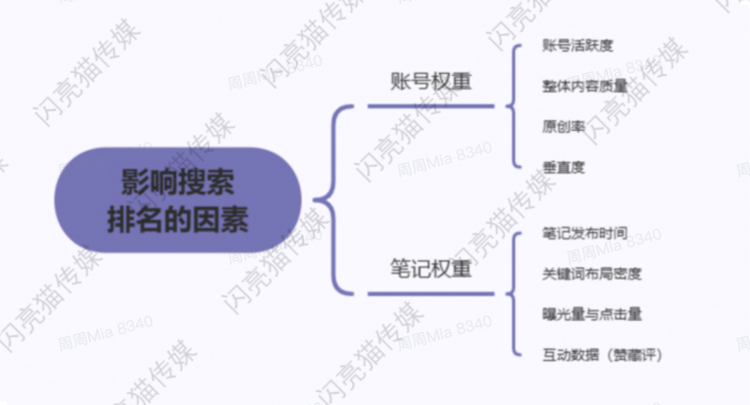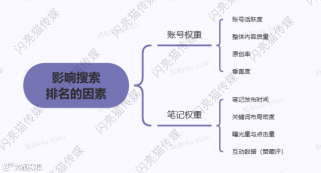 影响搜索排名的因素分别为账号权重和笔记权重,那账号权重和笔记权重下面又有不同的一个因子。