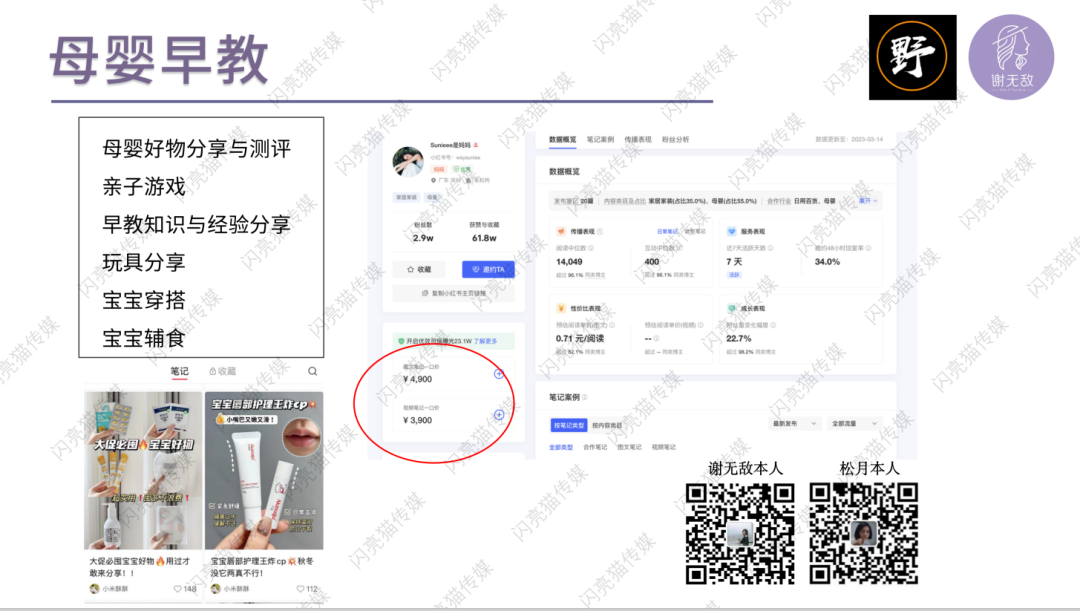 给大家展示一组蒲公英平台的数据,这组数据来自于sunny是妈妈,她其实只有2万9的粉丝,但是它图文笔记的报价高达4900元,视频笔记的报价3900元。