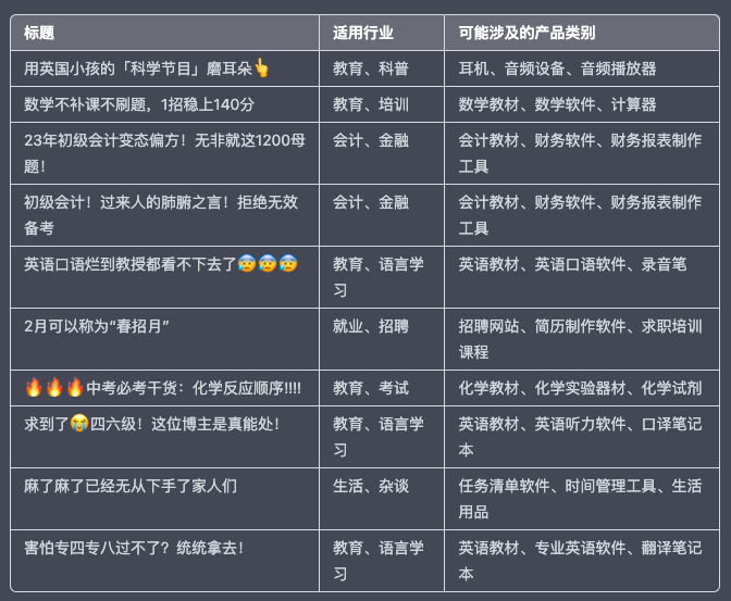通过投喂标题,先提炼出营销产品,再根据营销产品,拓展出相关品类,以品类,倒推细分赛道。