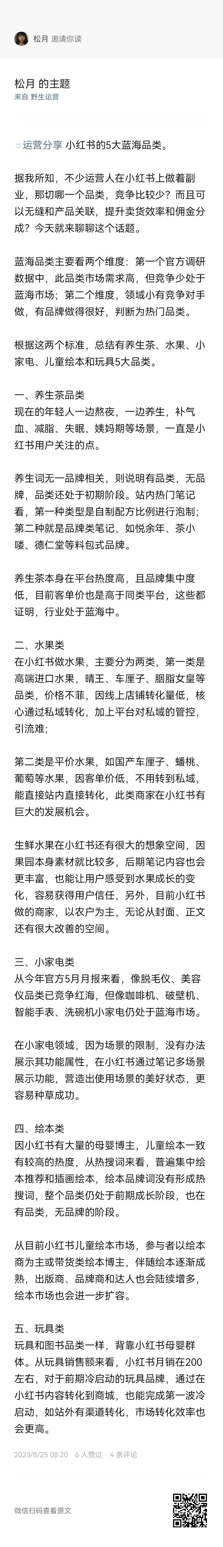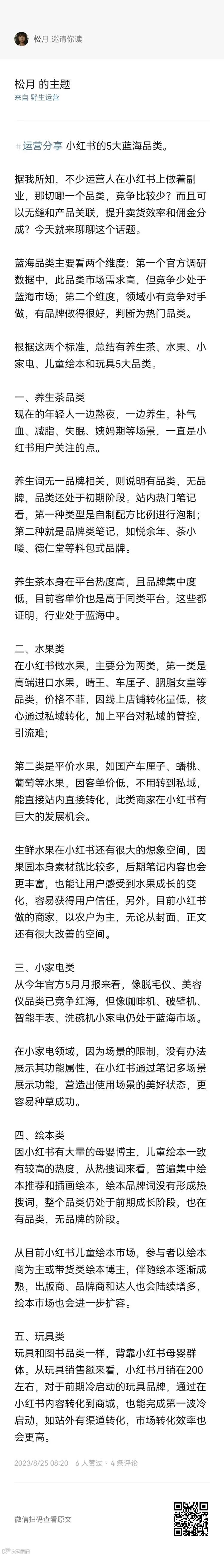 文末加餐:据我所知,不少运营人在小红书上做着副业,那切哪一个品类,竞争比较少?而且可以无缝和产品关联,提升卖货效率和佣金分成?今天就来聊聊这个话题,扫码可以查看全文咯👇👇👇