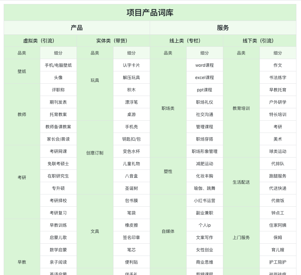 当然,一个虚拟产品类,不足以满足选择的需求,索性把两大类四小项都一起挖了,整理成了这个产品项目词库。