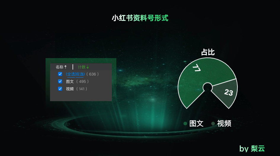 笔记形式:图文495,视频141,引流笔记依然以图文为主,制作成本低,用视频形式做差异化,会是一个机会。