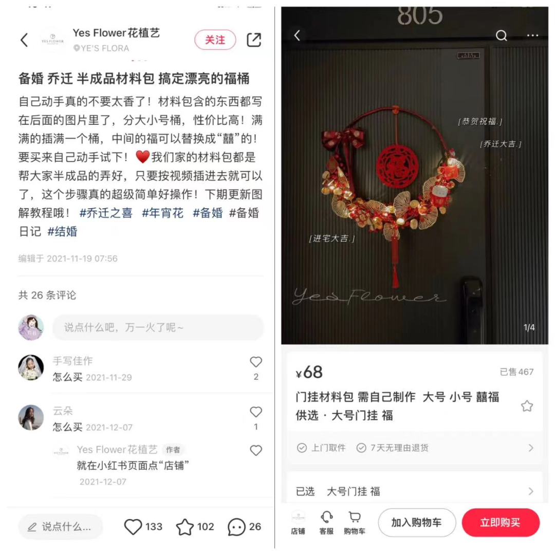变现模式:主打的就是DIY,以备婚、乔迁为场景进行种草,通过发笔记,引流到小红书店铺下单。