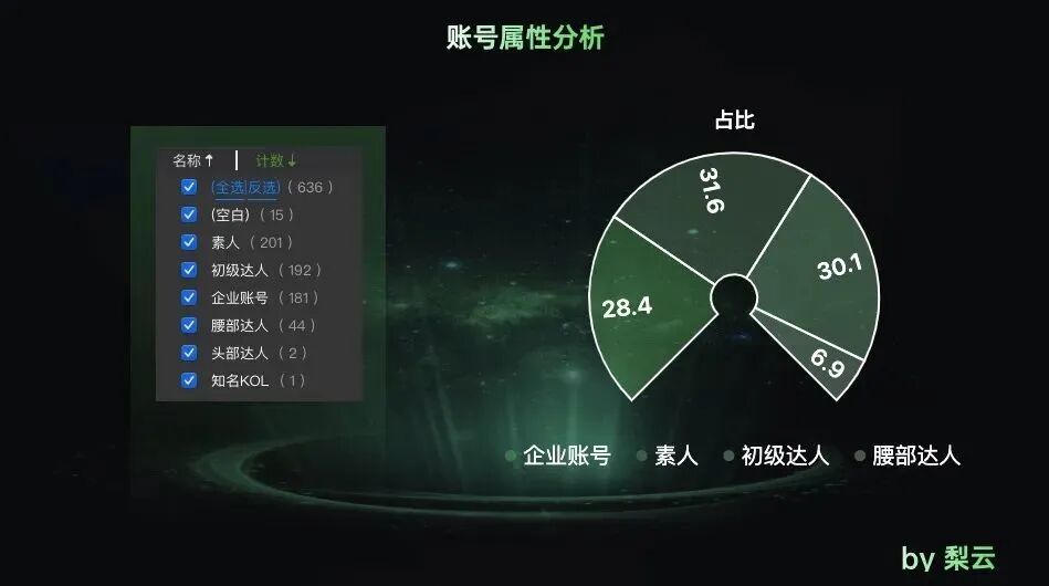 再看【素人】【初级达人】【腰部达人】【头部达人】的数量,201、192、44、2,都是小号引流占多数,毕竟粉丝还没累计,就限流要注销了。