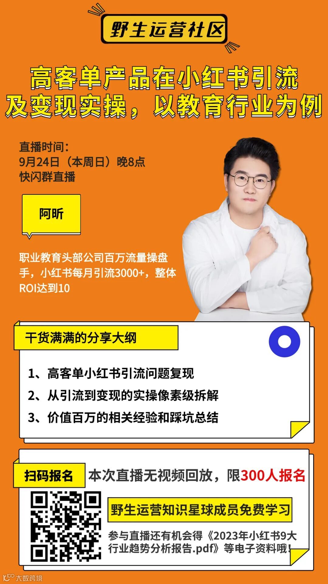 据我所知,野生运营里从事教育行业的小伙伴很多,对于这类“高客单+高决策”产品如何在小红书高效引流和变现?本周日晚8点,我邀请阿昕,职业教育头部公司百万流量操盘手,小红书每月引流3000+,整体ROI达到10,带来分享《高客单产品在小红书引流及变现实操,以教育行业为例》,本次分享不设视频回放,限量场观 300 人,想报名的小伙伴先上车!
