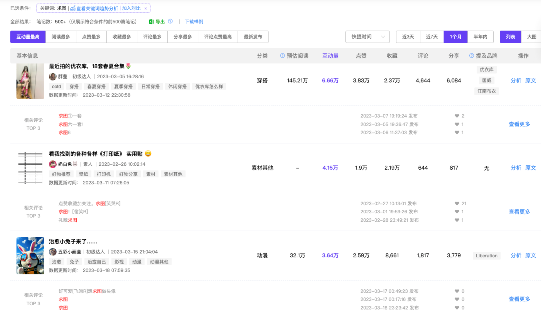 我挑了【求资料】这个词,通过千瓜评论检索,获取批量商机笔记的相关信息。