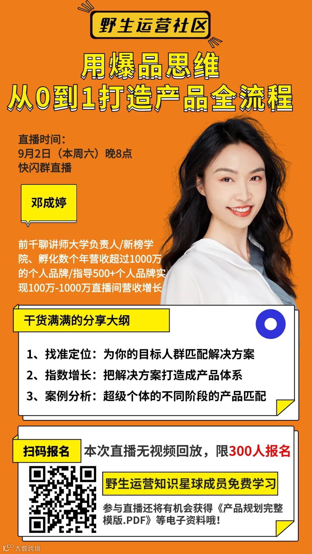福利接二连三:本周六晚8点,成婷空降快闪群给大家带来分享《用爆品思维,从0到1打造产品全流程》。本次分享不设视频回放,限量场观 300 人,想报名的小伙伴先上车😎参与直播,还有机会获得《产品规划完整模版.PDF》等电子资料哦:)