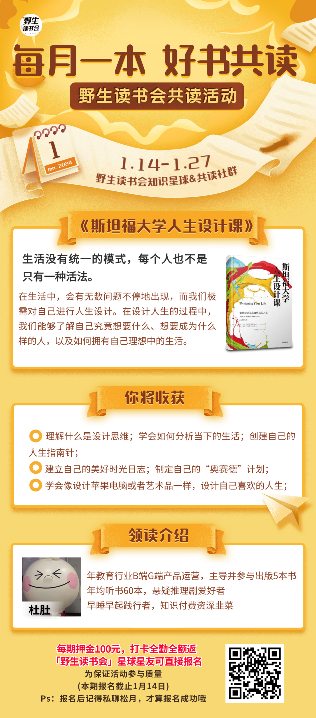 好消息来了,《斯坦福人生设计课》这本书不少小伙伴提议再此共读,就安排在 1月14日~1月27日!在野生读书会知识星球+读书会社群开启共读,只要是野生读书会星球的小伙伴,交纳 100元对赌押金就可以来报名,你不用准备纸质书,我们都会帮你准备好!