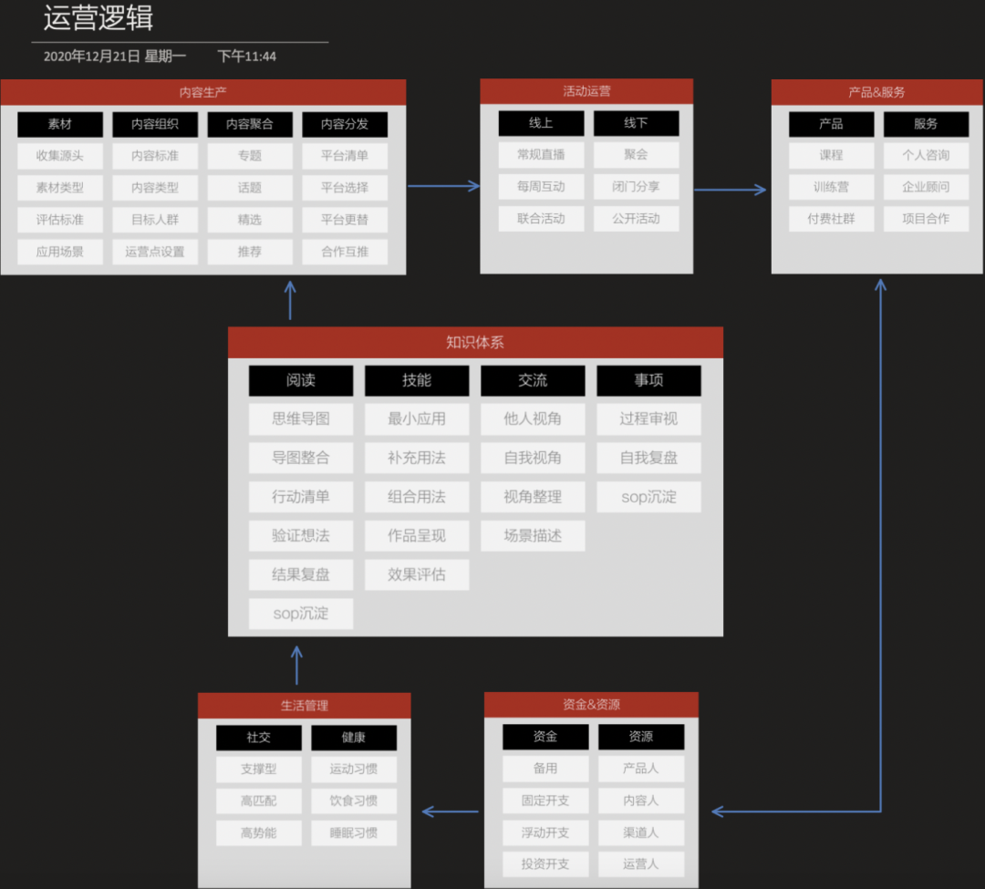 比如整个大系统里关于知识体系的构建,我就分为四个模块,阅读、技能、交流、事项,在这里事项的意思就是我去实践一些小的运营想法,包括此前偶尔在朋友圈搞搞小的运营活动等。四个模块下有更加具体的流程来帮助我整理我消化后的认知。