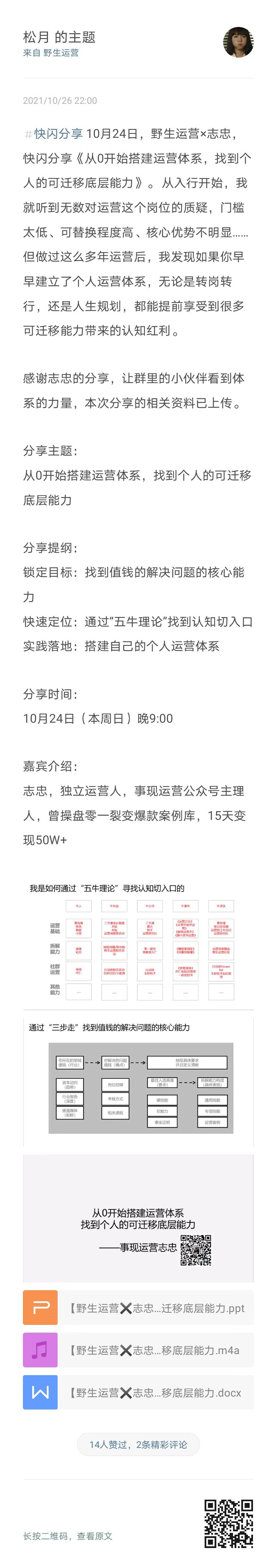 本文来自事现运营的主理人“志忠”往期在野生运营快闪群里分享主题《从0开始搭建运营体系,找到个人的可迁移底层能力》的精华部分,感谢志忠无保留的分享,让群里的小伙伴看到体系的力量,看到认知能产生的复利结果,本次分享的精华内容整理,其中的音频+PPT+知识脑图全部上传,如果想回顾全部,可扫码获取: