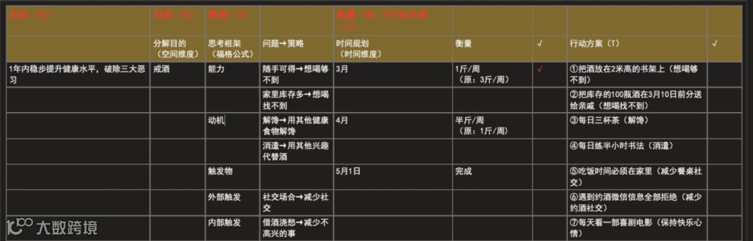 如何应用,分为目的、目标、行动策略、衡量一步步推下去,让每一步都有线索可追。具体可以参考下图的模板: