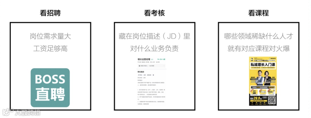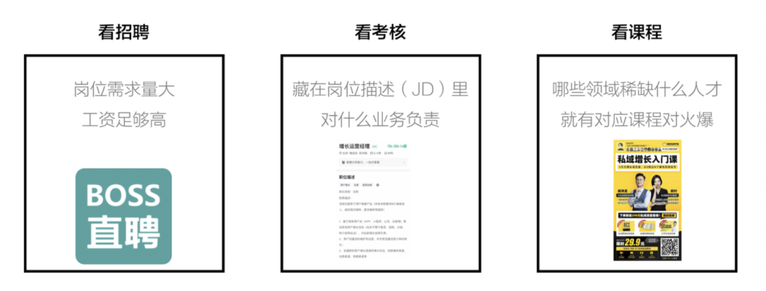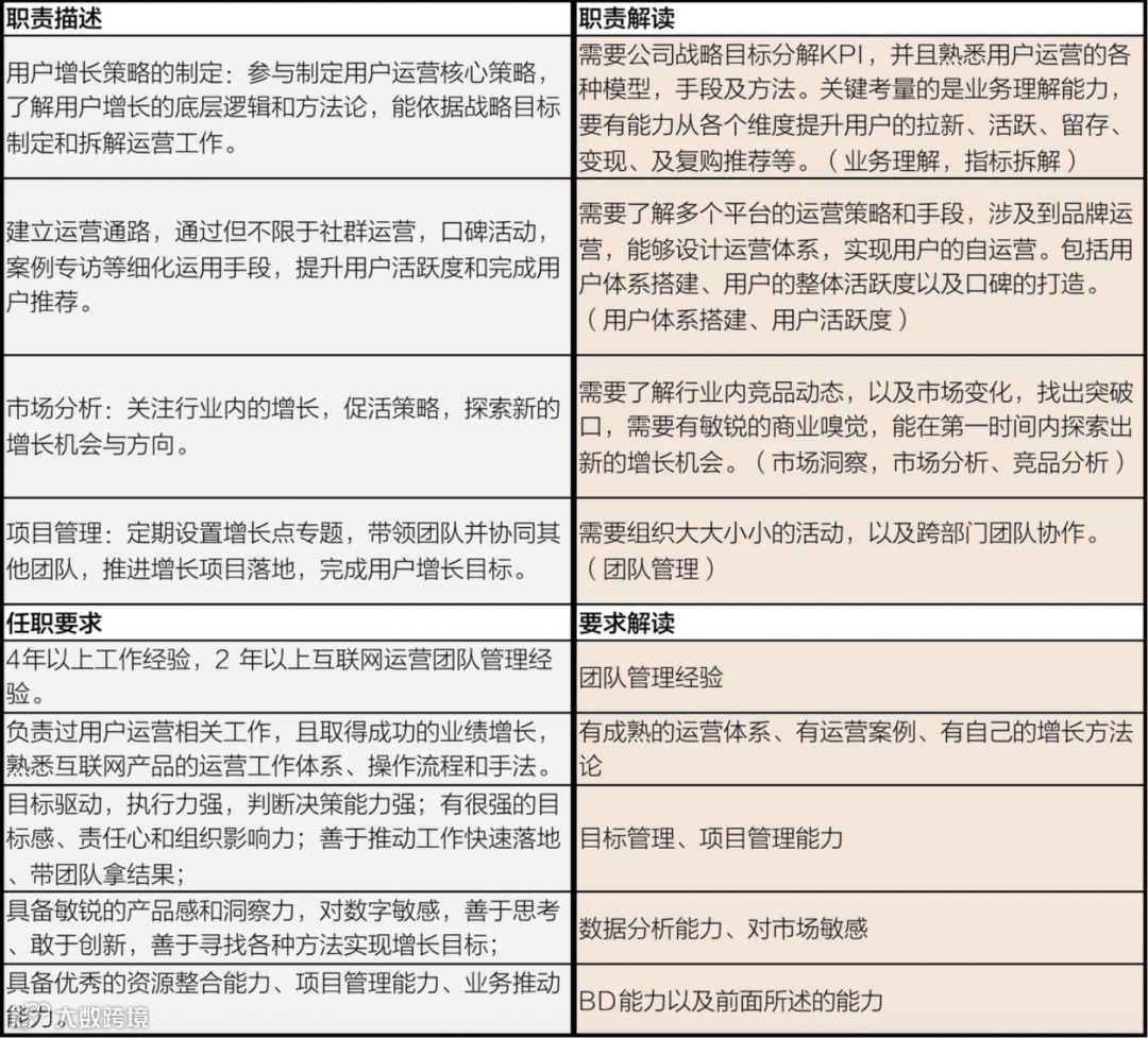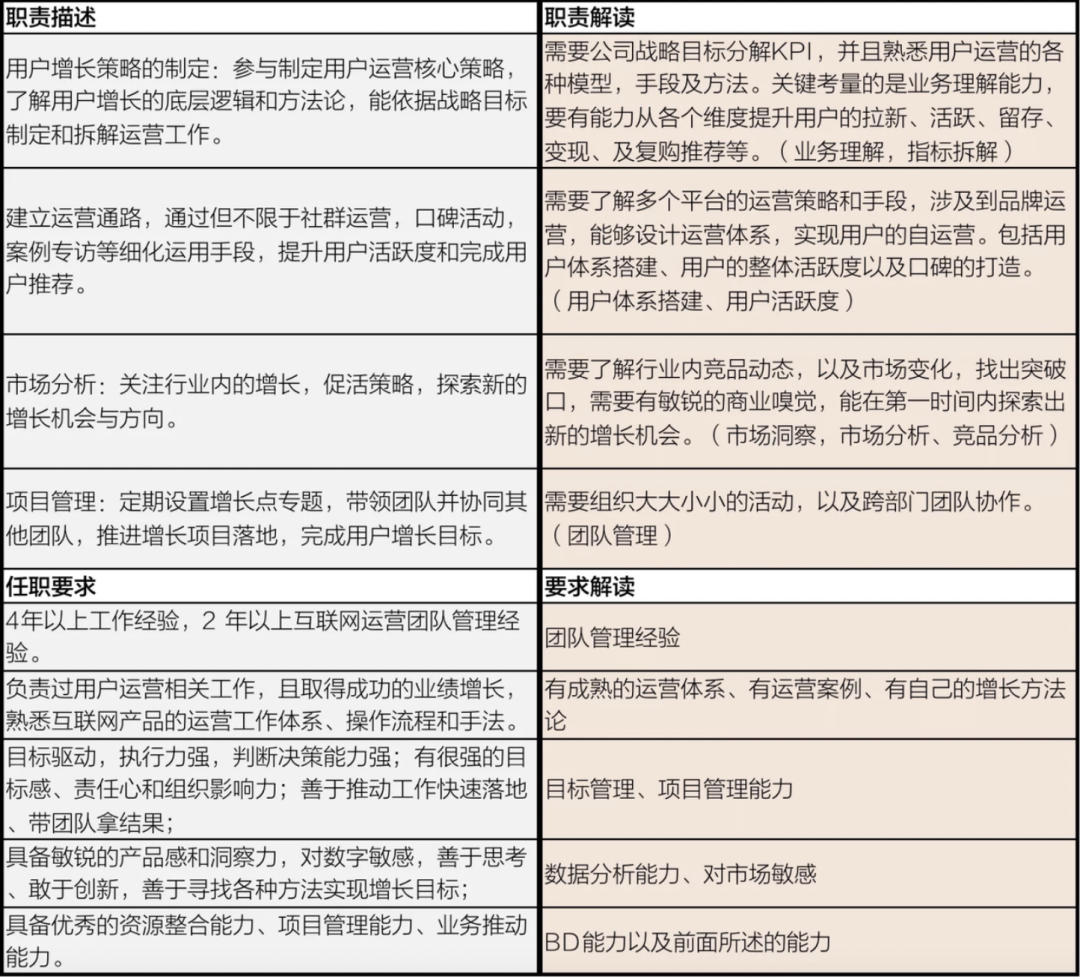 如果你想更值钱,就不妨去搜索对应的岗位。在每个岗位下都会有对应的岗位描述。在这些描述里隐藏着非常多的关键词,例如数据分析、增长体系搭建、团队管理、沟通协作等等等等。就像有人告诉了你考题范围,那么我们就只需要在范围内找出最优解就行。所以我们大概率会知晓,做啥业务、以及哪些能力是值钱的。
