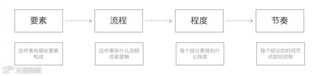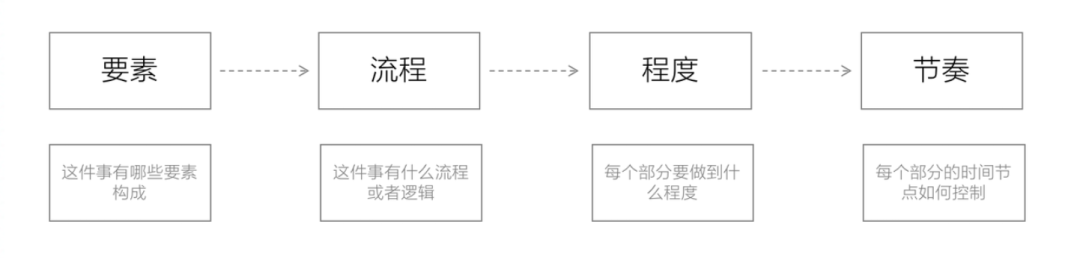 知道了前三个要素之后,第四个要素就是一件事的执行节奏,什么时间做什么事情才能产出更大的结果,我们在预计完成目标的时候,每个部分需要花多少时间。否则要么就容易出现,要素分解对了,流程对了,标准对了,但是时间没对,依然没法做好一件事。