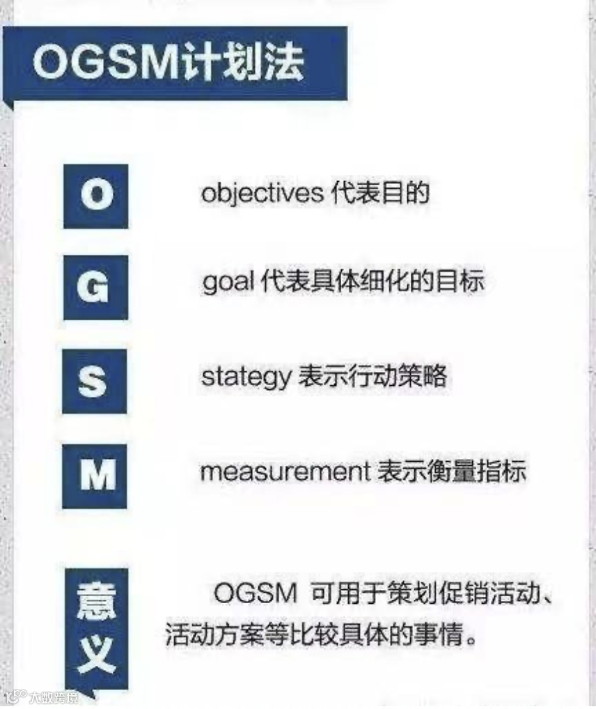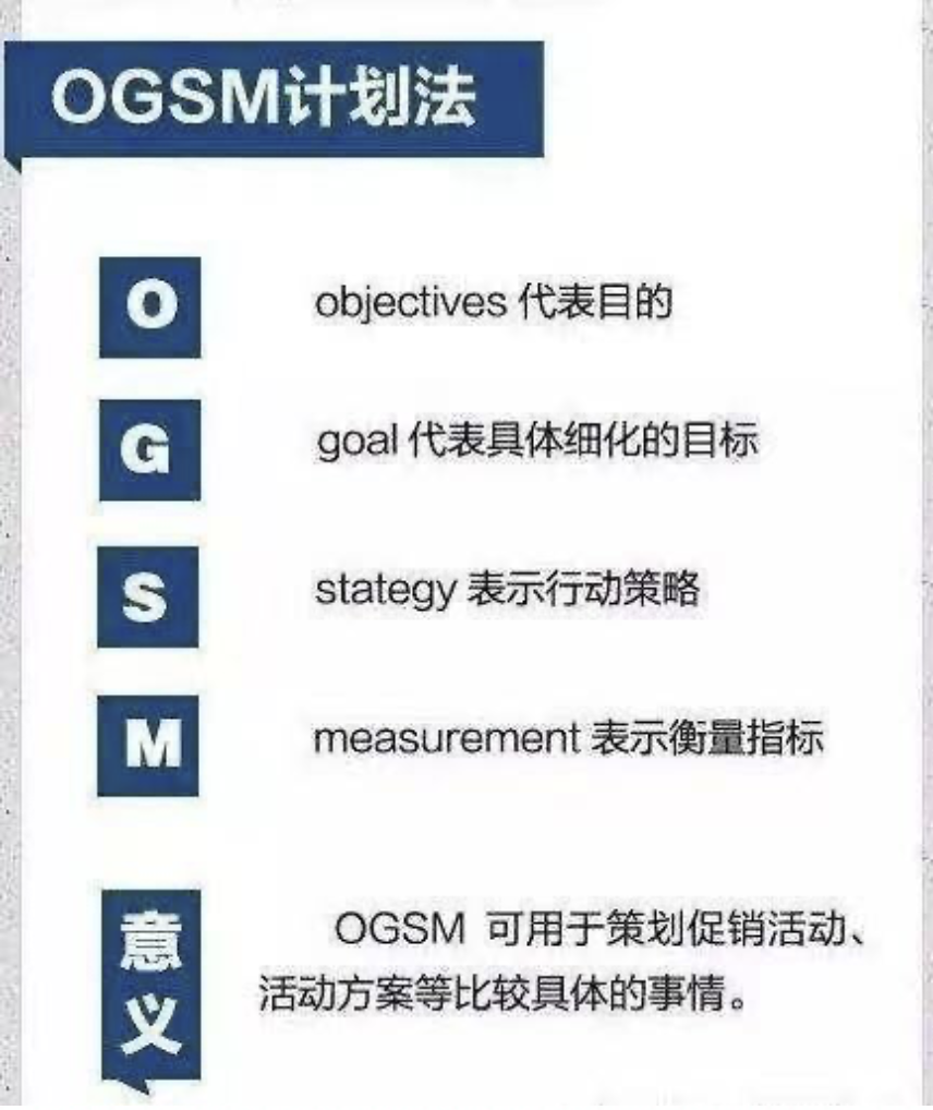 那么OGSM是什么呢,即目的,目标,行动,衡量。