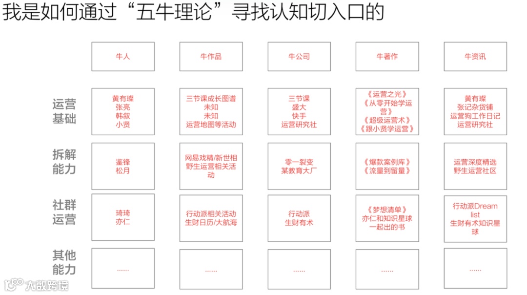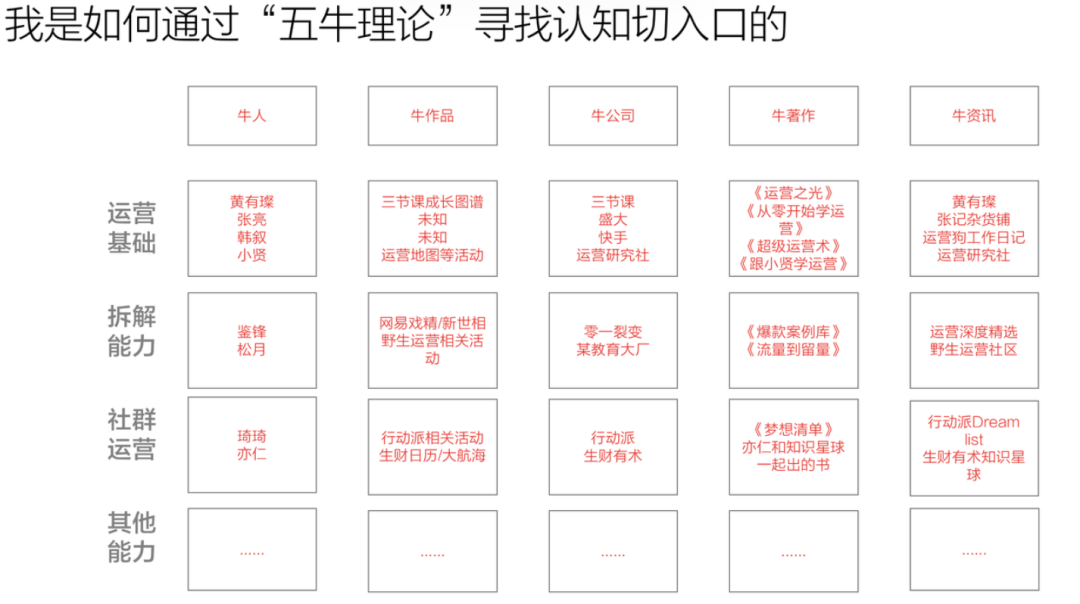接下来就进入到我们的第二部分,就是通过五牛理论,也就是寻找该领域的牛人、牛作品、 牛公司、牛著作、牛资讯。在每个模块下去找到对应的目标,然后逐一去分解。