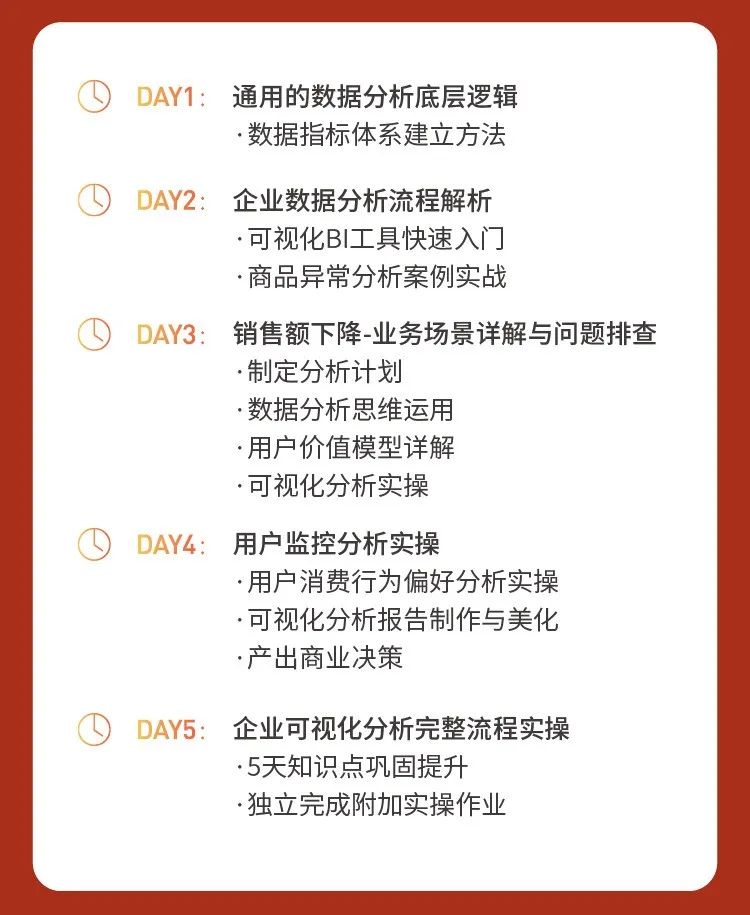 为了帮助大家解决以上难题,我们重磅研发了这门5天可视化分析实战营!并配套5天高质量社群服务和专业老师全天答疑指导。