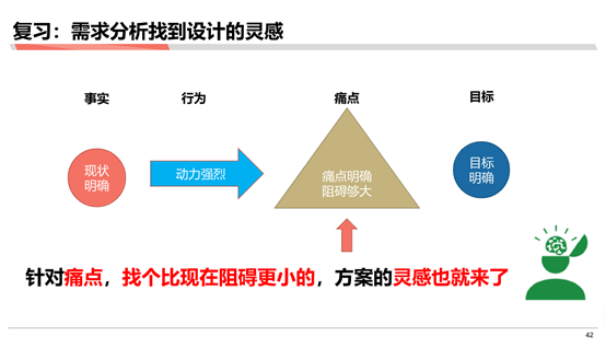 用户画像(需求分析)的四个维度:通过需求调研→了解现状→明确用户具体目标+明确用户是否曾具有达成目标的行为→具有此类行为,需求存在 →当行动>阻碍时,需求强烈。然后,通过需求分析找到产品设计灵感的关键是 :针对阻碍(痛点),找个比现在阻碍更小的。