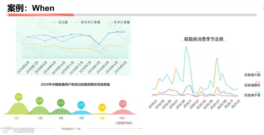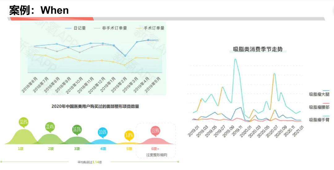 When:用户一年中哪个月份客户需求量高、一年中用户购买单个医美项目的数量差异分布、单个项目消费季节走势……