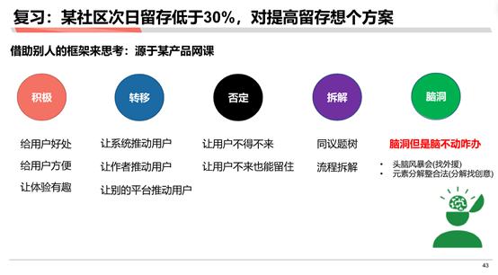 比如:网课 来源于某网课的分析框架-关于“某社区次日留存低于30%,如何提高留存想个方案”(见下图)